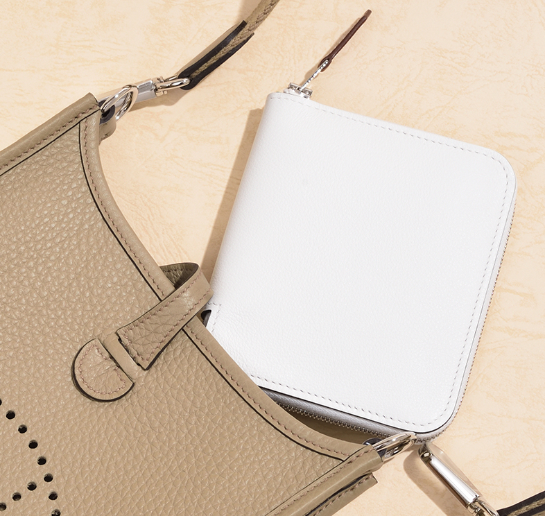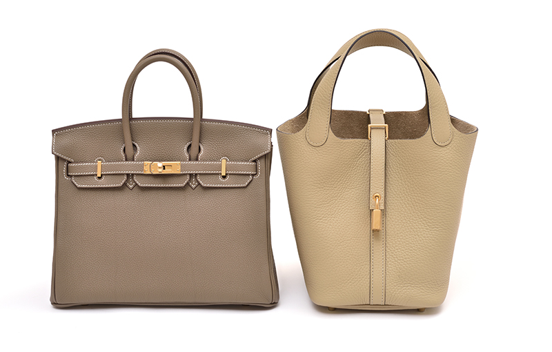 From left to right: Etoupe grey (Togo leather) / Trench (Clemence leather)