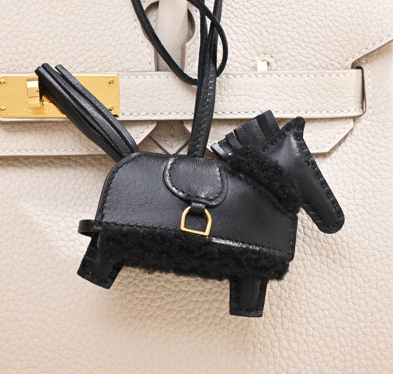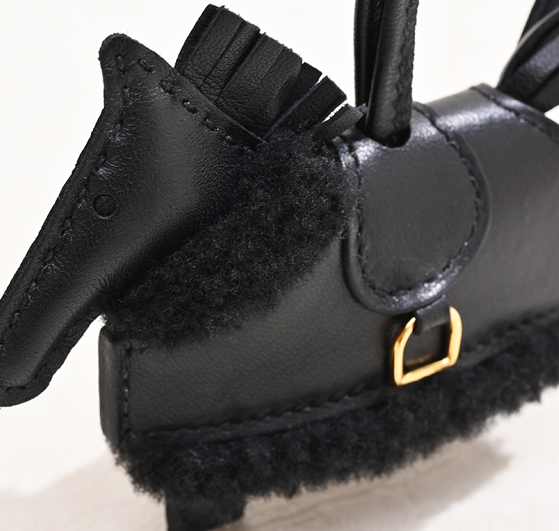 Its irresistibly charming design is enough to make hearts flutter at first glance, instantly drawing attention. Accented with fluffy merino wool at the neckline and hem, and finished with a sparkling stirrup detail on the saddle, it blends refined luxury with a touch of playful whimsy.